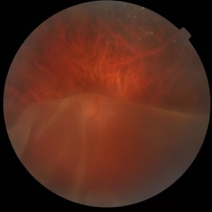 HIGH MYOPE WITH A CORRECTION OF -24D. SUDDEN VISION LOSS FOLLOWING TRAUMA. SUPERIOR RETINA FOLDED ON TO THE INFERIOR RETINA MASKING THE DISC IN A TRANSLUCENT VEIL.