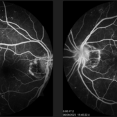 Buds on Tree Appearance on FFA: Old BRVO Buds on Tree Appearance on FFA: Old BRVOMar 12 2024 by MEENAL SONI A middle-aged man with idiopathic hypertension presented with old IT BRVO, sclerosed vein on with hemorrhages on fundus examination. FFA reveals delayed filling of vein with pruning of venules resembling buds on tree. Photographer: Dr. Meenal Soni, Fellow VR, ASG eye Hospital Jodhpur Imaging device: ZEISS Visucam 400 Condition/keywords: non-perfused branch retinal vein occlusion (BRVO)
