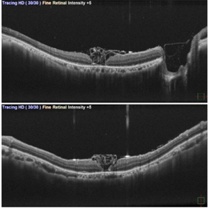 This is first post op day OCT of patient showing stuffed ILM in macular hole ,who underwent Vitrectomy with inverted ILM flap with silicon oil insertion in a case of RRD with FTMH.