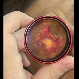 Optic nerve photo of a 53-year-old woman with proliferative diabetic retinopathy.