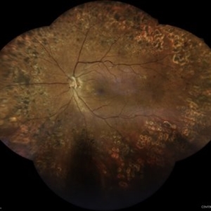 Wide-field composite fundus images of a 78-year-old male patient with a single functional eye due to poorly controlled diabetic retinopathy with activity data and multiple photocoagulation traces.