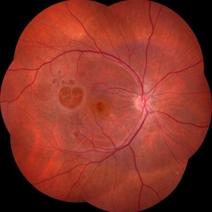 Fundus photograph of a 67-year-old woman with failed macular hole surgery, now referred to our clinic with 8 holes.