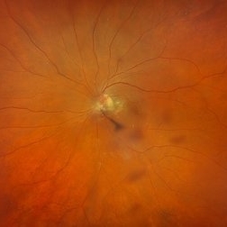 Fundus photograph of an 37 year old female presents with reddish vascular lesion with feeder vessels for possible Von Hippel-Lindau Syndrome.