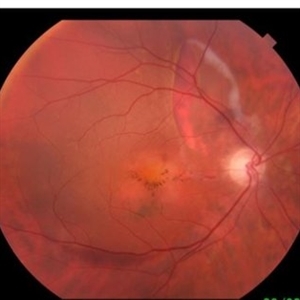 Fundus photograph of a 85 year-old male with AMD who developed very large PED with RPE-rip. BCVA is 20/70