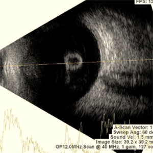 This picture shows RE USG of a 30 year old female with vitreous cyst with spontaneous vitreous hemorrhage in a case of retinitis pigmentosa.