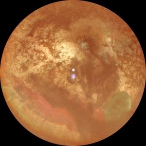 This picture shows RE color photo of a 30 year old female with vitreous cyst with spontaneous vitreous hemorrhage in a case of Retinitis Pigmentosa.