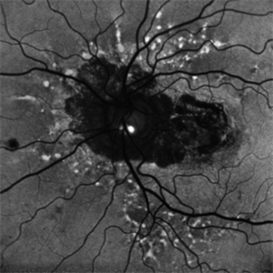 FAF showing angiod streaks , optic disc drusen, and macular atrophy secondary to macular neovascular membrane.