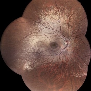 Widefield retinography of a case of newly diagnosed Oguchi Disease with silver-gold metallic sheen within the posterior pole.