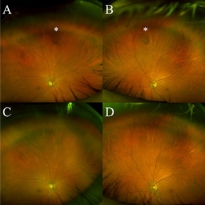 Fundus photography of 41 year old male demonstrating bilateral vortex vein vortices (A and B) which were demonstrated to disappear visually with prolonged upgaze (C and D).
