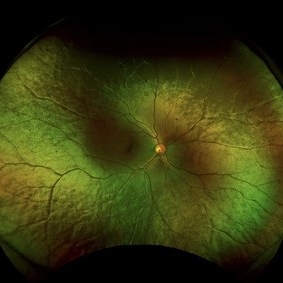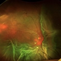 Fundus photograph of a 56 year old man with rhegmatogenous retinal detachment with a large nasal choroidal detachment.