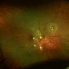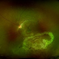 Fundus photograph of a 21 year old male with history of blunt trauma with fist presenting with a large linear posterior break just adjacent to the infero-temporal arcade with choroidal rupture and subretinal bleed passing through fovea. Successful barrage laser of the break can be seen.