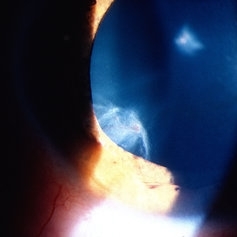 Iron deposition in the iris epithelium and sphincter and on lens epithelium in the same patient ; #2.