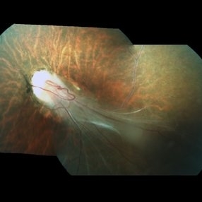 Fundus photograph of 25-year-old female with Familial Exudative Vitreoretinopathy ; right eye showing total retinal detachment with proliferative vitreoretinopathy.
