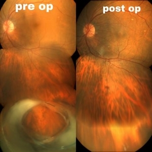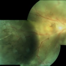 Fundus photograph of a 8-year-old female with C/O DM/VN OS showing vitreous traction band dragging of macular and disc OD showed retinal detachment
