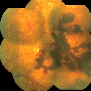 A montage of an eye with high risk PDR having pre retinal hemorrhage. Florid NVE are noted in the temporal quadrant. peripheral PRP marks are seen .
