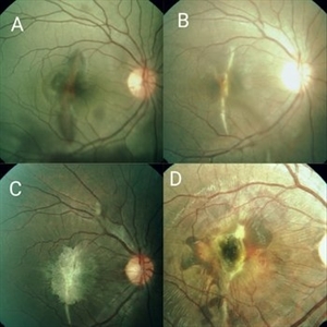 A 16-year-old boy had a blunt injury to the right eye from a cricket ball. Fig A shows Berlins' edema with choroidal rupture which progresses to develop a secondary CNVM (Fig. D) over 1 year.