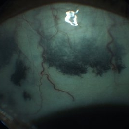 Fundus photograph of a 50-year-old male corneal vascularization with spheroidal degeneration.