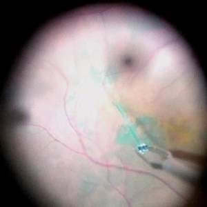 Intra-operative photo highlighting the utility of ICG for ILM visibility.