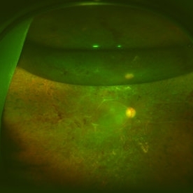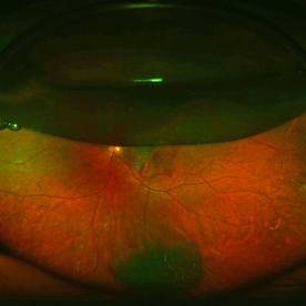 Wide-angle viewing photography of a 67-year-old man with massive submacular hemorrhage.