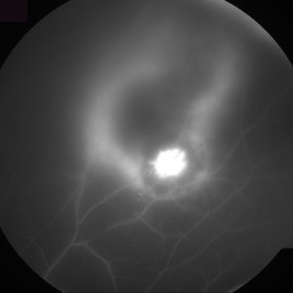 Toxoplasma Gondii Chorioretinitis, Fluorescein Angiogram Toxoplasma Gondii Chorioretinitis, Fluorescein AngiogramAug 23 2012 by Gerardo Garcia-Aguirre, MD Fluorescein angiogram of the superior periphery showing a highly hyperfluorescent lesion adjacent to a hypofluorescent lesion, surrounded by a hyperfluorescent halo. Photographer: Noemí Hernández, Asociación para Evitar la Ceguera en México Imaging device: Zeiss FF4 Condition/keywords: chorioretinal inflammations, toxoplasmosis