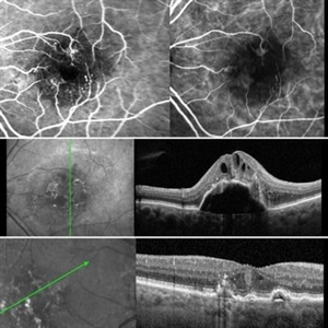 Retinal angiomatous proliferation (RAP) is a unique variant of neovascular age-related macular degeneration. Published studies have estimated that up to 15% of patients with neovascular age-related macular degeneration have RAP. Clinical features frequently associated with RAP include bilateral disease, presence of pigment epithelial detachments, and reticular pseudodrusen. RAP is more frequently associated with the development of retinal pigment epithelial tears and geographic atrophy that can lead to severe vision loss. We present a stereo fluorescein angiography and ICG (upper right and left image respectively) and OCT of left and right eye (middle and inferior image) of a RAP choroidal neovascularization in an 89-year-old patient.