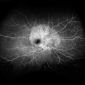 A 31-year-old patient with a complaint of photophobia and low visual acuity OD in the previous three weeks. BCVA was 20/60 and 20/20 The fundus examination revealed a placoid white lesion in the posterior pole and vitreous cells in the right eye. The left eye was unremarkable. Fluorescein angiography reveals hyperfluorescent plaque with distinctive “leopard spots” hypofluorescence.