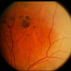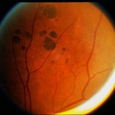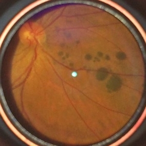 Male 43-years-old, BCVA BE 6/6, asymptomatic, Fundus RE multiple hyperpigmented circular/oval well defined lesions present inferonasally to the optic disc.