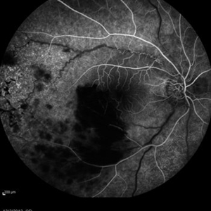 Wide- field fluorescein angiogram of the left eye of a 28-year-old woman with acute drop of vision due to occlusive retinal vasculitis leading to extensive capillary nonperfusion and macular infarction.