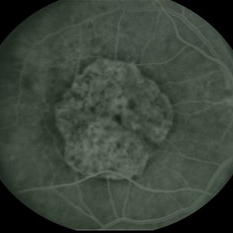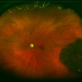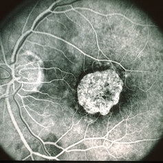 49-year-old female referred for presumed ocular melanoma. On examination was noted to have darkly pigmented lesion in the temporal retina of left eye. Lesion had characteristic scalloped edges with central lacunae, however, on ultrasonography was noted to have 1.8mm of elevation with high internal reflectivity. IVFA shows absence of dual circulation with areas of window defect. Findings were consistent with those described by Shields et al., in their April 2001 article in Archives of Ophthalmology.