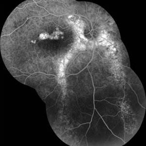 Fluorescein angiogram from a 71-year-old woman who underwent numerous sessions of pan retinal laser photocoagulation for proliferative diabetic retinopathy in the remote past. Note the widespread severe secondary atrophy, with only the central macular RPE remaining. Note the choroidal vessels through the diffuse window defect in the peripheral macula and near periphery.