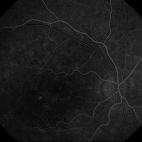 FAG of 58-year-old male. In early venous phase hyperflorescence of white dots (caused by window defect) can be seen. Leakage of dye in juxtafoveolar region.