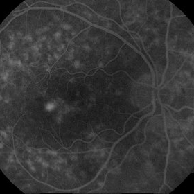 FAG of 58-year-old male. In late venous phase hyperflorescence of white dots (caused by window defect) can be seen. Intensive leakage of dye in juxtafoveolar region.