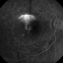 Late transit FA of a large active subfoveal CSCR leak. Focus is on peri-foveal vessels to give sense of height of large serous RD of macula. This patient presented with a BCVA of 20/200 and fluorescein and historic evidence of prior episodes of leakage. After discussion of known treatment options including observation, he was initially treated with rifampin and had partial resolution to 20/70 BCVA but this was short-lived with reaccumulation of the large serous detachment within 3 months. He then received sub-threshold micro-pulse laser photocoagulation with an 810 nm diode laser which resulted 1 month later in complete drying of the serous detachment and BCVA of 20/25.
