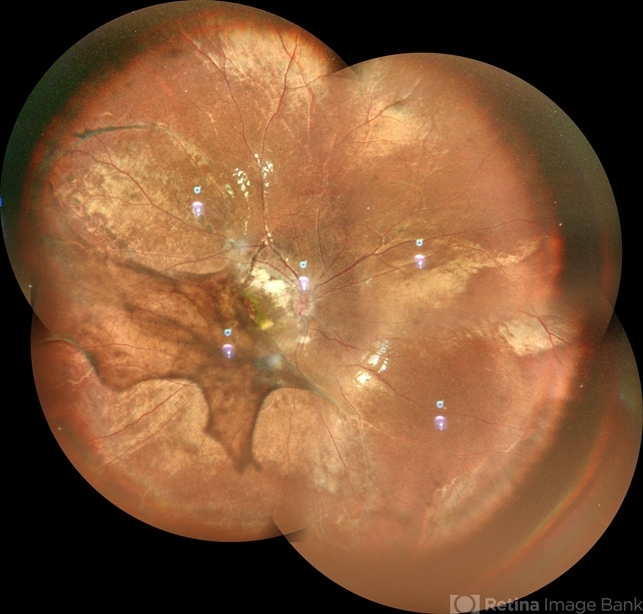 - Colour picture( montage) of RE in a 10 year male child a case of FEVR. with macular hole.