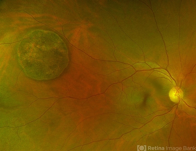 - Right eye fundus photograph of a 42 year old asymptomatic male demonstrating a superotemporal solitary large Congenital Hypertrophy of Retinal Pigment Epithelium (CHRPE) lesion.