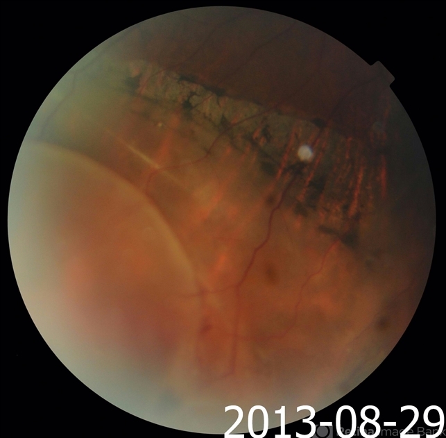 - Color fundus photograph of the right eye of a 40-year-old man with longstanding retinal detachment showing a broad pigmented demarcation line and a retinal macrocyst as well as patches of retinal hemorrhages.
