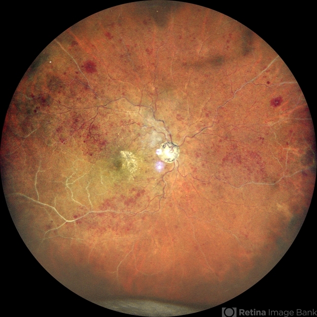 - A widefield color photo image of RE of a 60 year old male in a case of central vein occlusion.