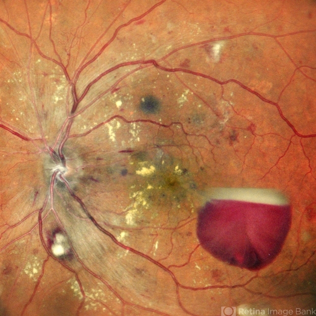 - A central photo of a 50 year old male case of PDR showing a sub-hyaloid hemorrhage with cotton wool spots , hard exudates at the fovea with dot and blot hemorrhages.
