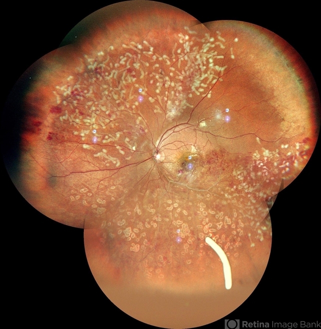 - A color photo montage of an 32 year old male of LE showing laser marks in inferior and superior half with an floating ozurdex implant (inferiorly) in a case of idiopathic retinal vasculitis.