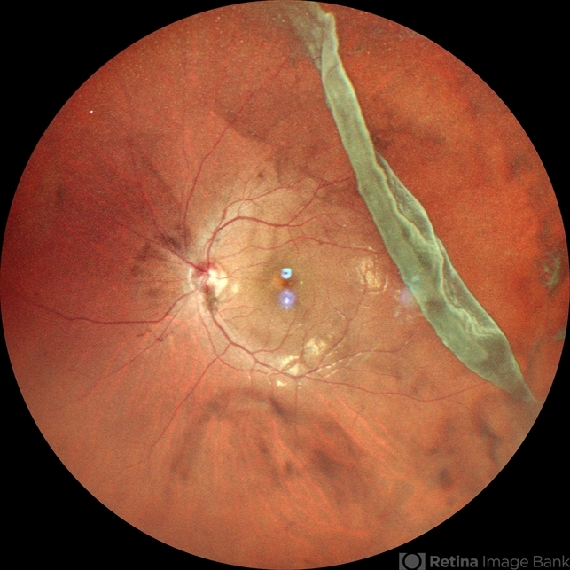 - Widefield fundus photograph of LE showing giant retinal tear extending from 12 to 4 o clock.