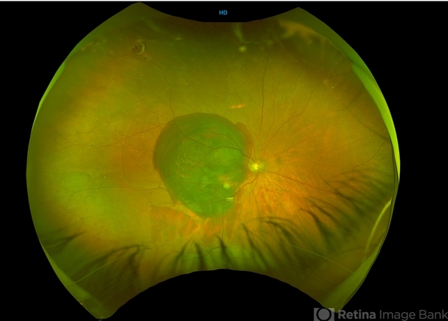 - A widefield image of right eye of a 65 year old male showing large subretinal bleed at the posterior pole most likely in a case of PCV.