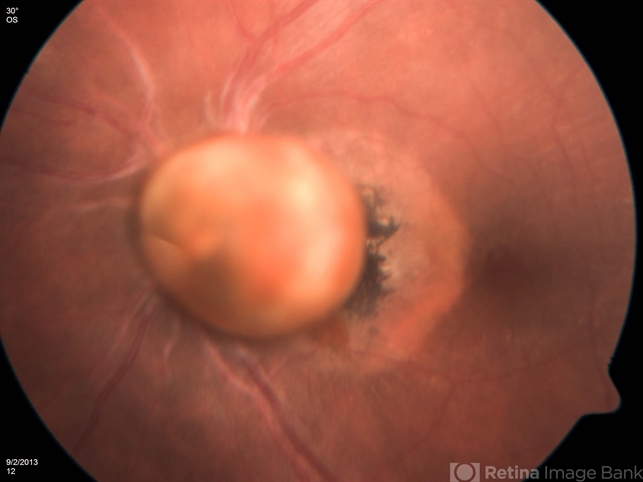 - encapsulated intraocular foreign body, intraocular foreign body, fundus photograph