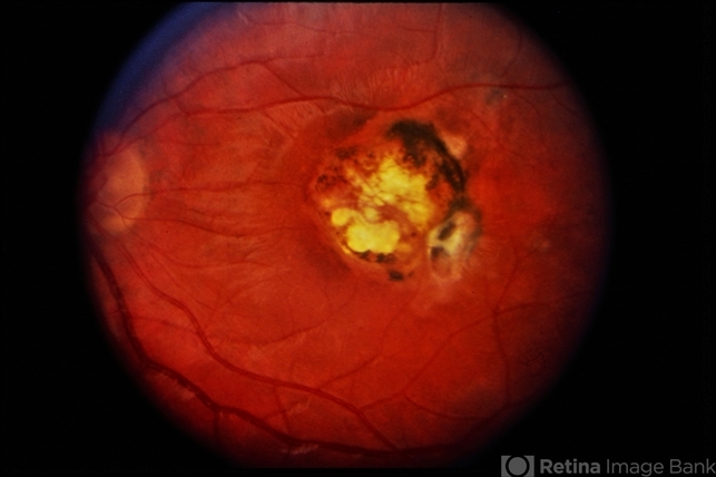 - 8-year-old female, toxoplasmosis / macular scar / active.