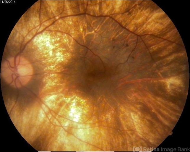 - Fundus photograph of the left eye of a 33-year-old male with choroideremia, showing diffuse chorioretinal atrophy.