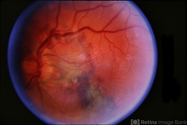 - Large peripapillary choroidal new vessel membrane with hemorrhage, OS.