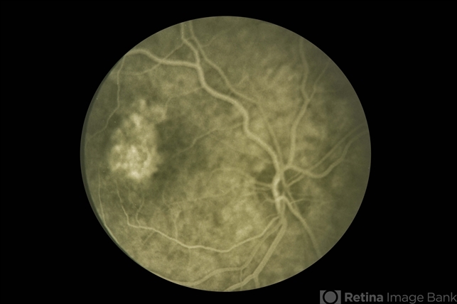 - OD fluorescein angiogram with central transmission. Presumably Presumed Ocular Histoplasmosis Syndrome.