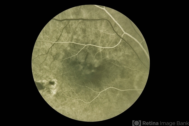 Fluorescein angiogram of OD with temporal atrophic scar and central soft PED with hot cross bun. Presumably Presumed Ocular Histoplasmosis Syndrome.