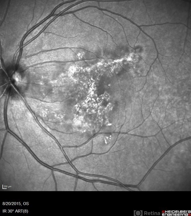 Red free photograph of an 18-year-old with macular serpiginous choroidopathy.