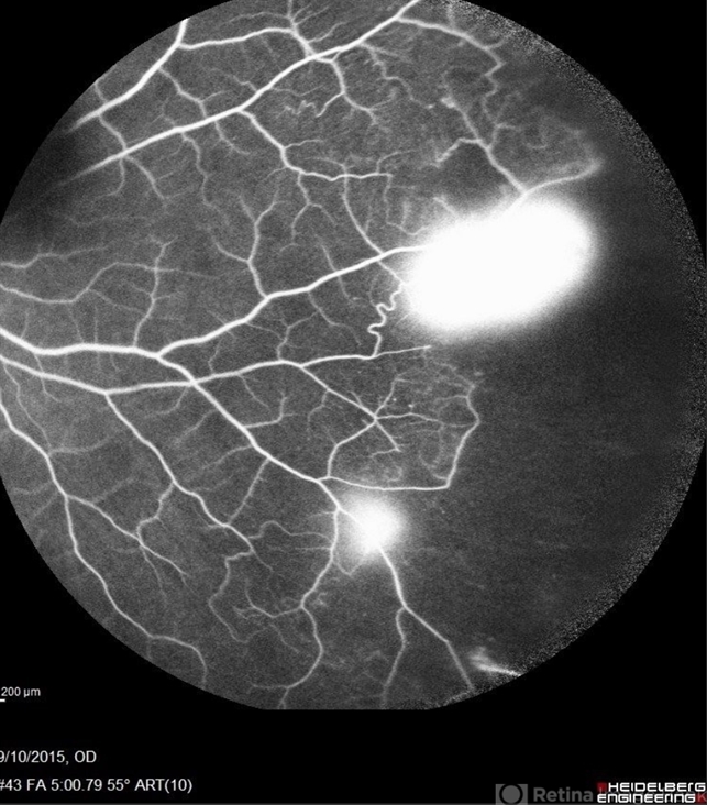 Angiography showed normal vessels posteriorly but severe capillary drop out throughout the periphery OU with scattered severe neovascularization at the edge of the capillary drop out peripherally.