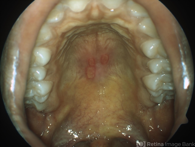 - A 19-year-old boy presented with with recurrent oral and genital ulcers along with blurring of vision. Systemically he was HLA B-51 Positive suggesting Behcet's Disease. The photograph depicts the classic aphthous mouth ulcers seen in the Behcet's disease.